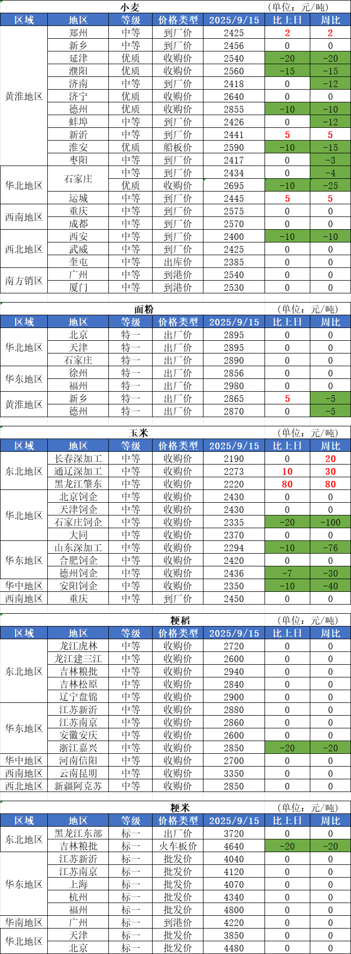 1、9月15日,小麦加工企业收购价格稳中偏强,山东、河北、河南、江苏等地企业不同程度的上调收购价,涨幅在2-6厘之间。受上周降雨天气影响,部分厂家上量偏少,低库存运作策略下有补库需求,支撑价格上行。