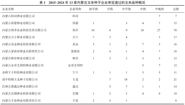 从中国种业大数据平台整理得到2015-2024年13家内蒙古玉米种子企业审定通过的玉米品种概况(表1)。