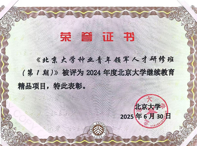 “种子是农业的芯片。”党的十八大以来,习近平总书记高度重视中国种业发展,明确指出“必须下决心把我国种业搞上去,实现种业科技自立自强、种源自主可控”。在这一重要战略指引下,北京大学现代农学院积极担当,勇于创新,于2024年成功举办的首期“北京大学种业青年领军人才研修班(1期)”近日荣膺“北京大学继续教育精品项目”称号,这是对项目质量与影响力的高度认可,更是北大农学服务国家战略、培养种业领军人才的重要里程碑。