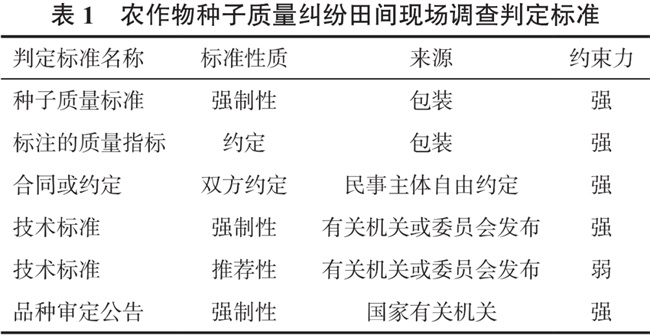 鉴定专家组出具鉴定结论可以参考种子包装中列明的种子质量标准、双方的合同约定、有关技术标准、品种审定公告关键性状描述等内容作为判断的重要标准(表1)。