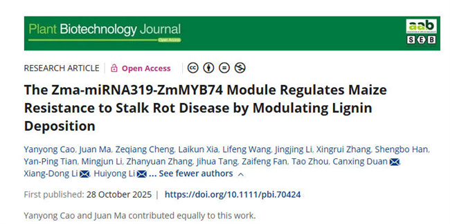 近日,河南省农业科学院曹言勇-李会勇团队联合中国农业科学院作物科学研究所段灿星团队、山东农业大学李向东团队在Plant Biotechnology Journal(中科院一区Top期刊,5年平均影响因子12.5)在线发表题为“The zma-miRNA319-ZmMYB74 module regulates maize resistance to stalk rot disease by modulating lignin deposition”的研究论文,该研究通过多维组学整合分析,成功鉴定出zma-miR319-ZmMYB74这一关键调控模块,系统阐明了其通过负向调控木质素合成关键基因ZmCAD从而影响玉米茎腐病抗性的分子机制,为玉米抗病分子育种提供了新的理论依据和宝贵的基因资源。