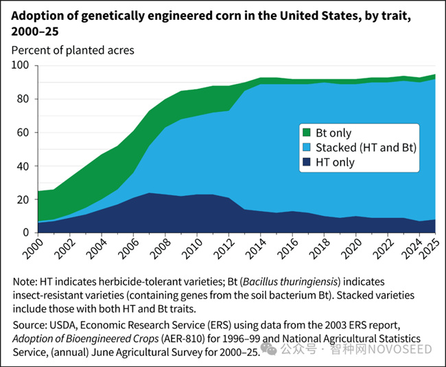 在2000年,绝大多数转基因玉米仅含单一性状;而到了2025年,绝大部分种植面积使用的是同时具备耐除草剂和抗虫性的复合品种。