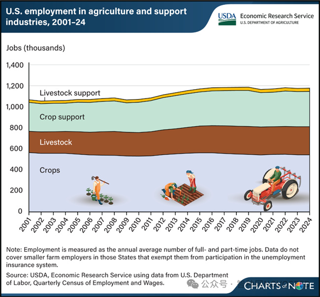从2001年到2024年的数据来看,美国农业的总就业人数保持了相对稳定的态势,并呈现出轻微的增长趋势。总职位数量从2010年的约110万个增加到了2024年的近120万个。