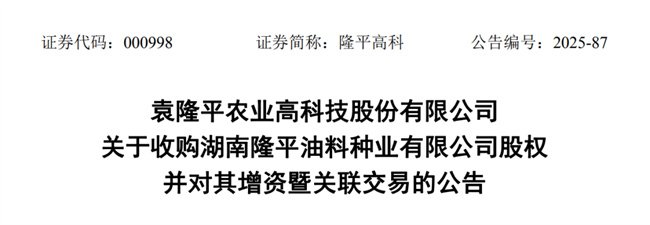 隆平高科发布关于收购湖南隆平油料种业有限公司股权并对其增资暨关联交易的公告。
