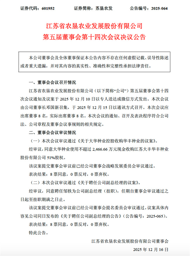12月15日,江苏省农垦农业发展股份有限公司第五届董事会第十四次会议决议公告发布。