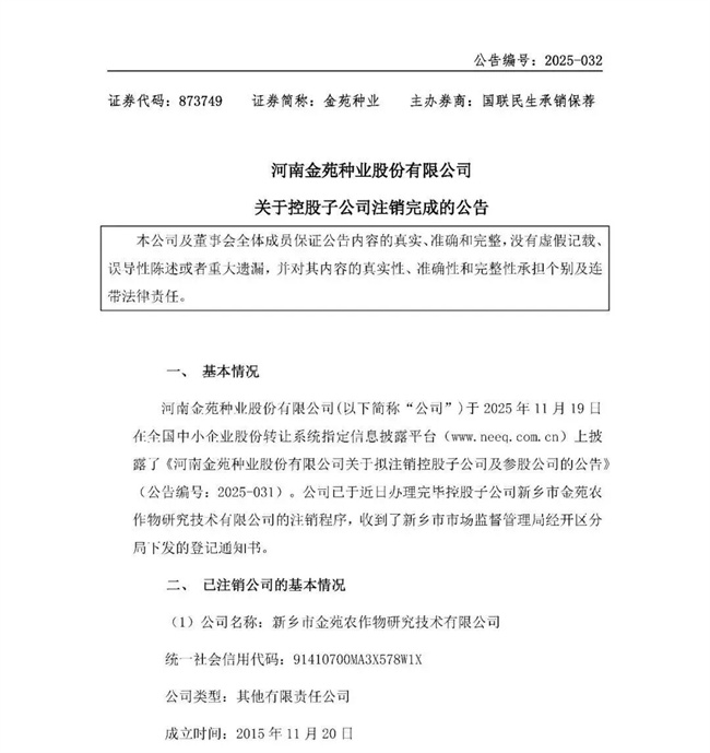 近日,河南金苑种业股份有限公司(下称“金苑种业”)在全国中小企业股份转让系统指定信息披露平台上披露了《河南金苑种业股份有限公司关于拟注销控股子公司及参股公司的公告》(公告编号:2025-031)。