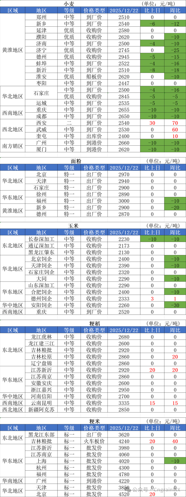 1、12月22日,国内小麦市场价格大致持稳,局部面粉企业小幅下调收购价格,跌幅在2-3厘。例如山东潍坊香野小麦收购价下跌2厘执行1.27元/斤,大名五得利麦价下跌2厘执行1.25元/斤。