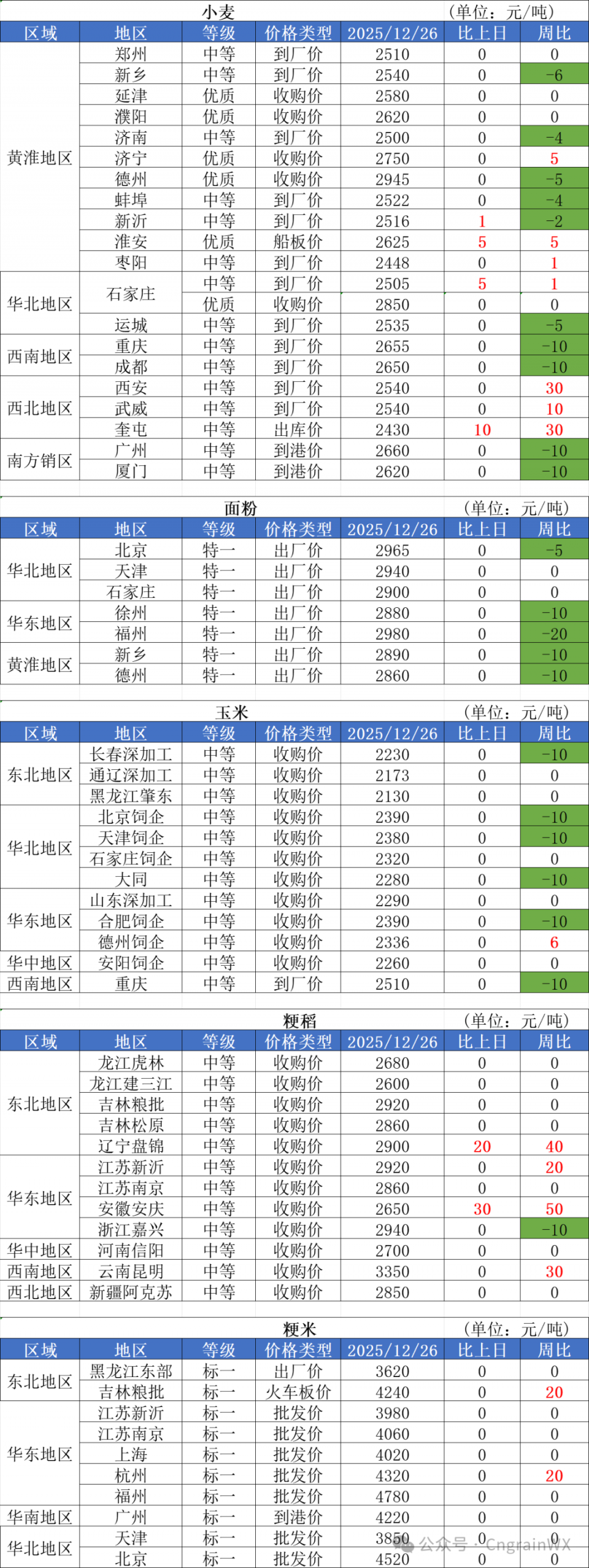 1、12月26日,小麦加工企业收购价格延续涨势,涨价区域集中于山东、河北、河南、江苏等主产区,幅度在3-5厘。当前市场看涨情绪有所升温,部分区域政策粮拍卖出现溢价成交。