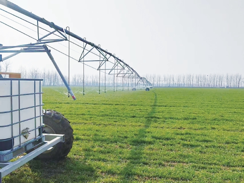 在黄淮海(宿州)种业科技谷的高产栽培示范区,平移式灌溉机正在进行灌溉作业。 宿州市委宣传部供图