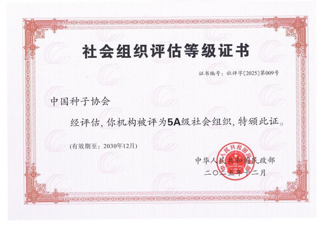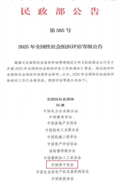 根据民政部印发的《2025年全国性社会组织评估等级公告》(民政部公告第585号),中国种子协会在“2025年全国性社会组织评估”中,荣膺最高等级——“5A级社会组织”。