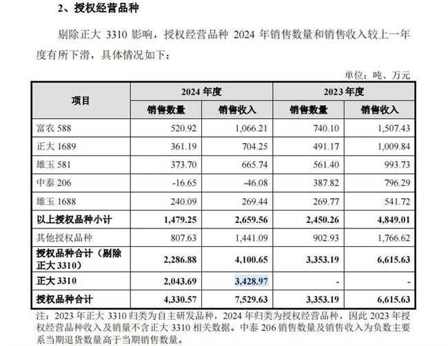 在正大种业的产品矩阵中,“正大3310”无疑是近年来的明星单品。2024年该品种销售收入达到3428.97万元,成为公司第四大单品。然而,二轮回复披露了一个细节:正大3310的植物新品种权已于2024年3月转让给了隆平高科(000998),目前正大种业仅拥有该品种的“独家生产经营授权”。