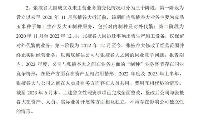 2023年,正大种业承接了张掖谷大的代繁业务,当年代繁业务收入骤增至3993万元,监管质疑其是否存在通过代繁业务调节业绩、减缓主业下滑的情形。