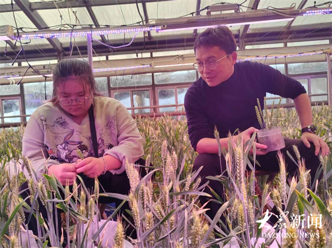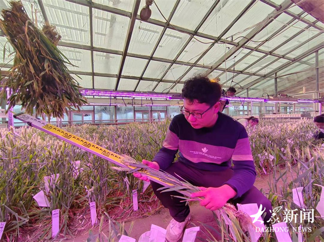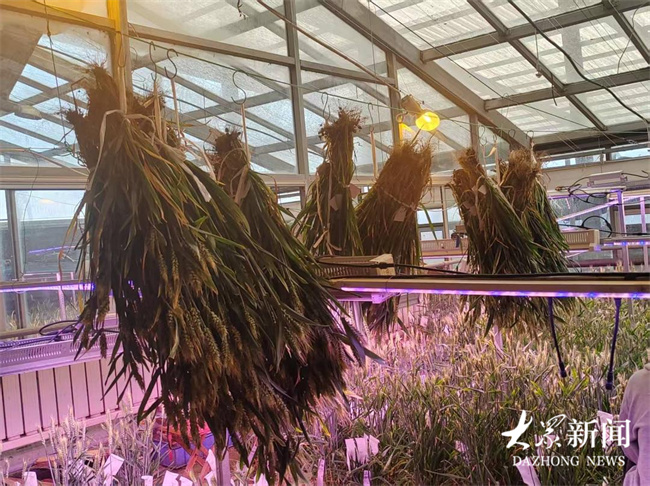翟林德介绍,冬季在温室内,小麦育种材料下地后,除及时肥水管理、精准控制温度外,还需要科学补充“光肥”,即补充特定光谱的红光、蓝光、近红外等光。在系列硬核科技的加持下,温室内的育种材料按预期时间成熟。在现场,小麦收获后,被倒挂在温室内晾晒绳上,这样能让茎秆里遗留的营养进一步回流到籽粒中,促进籽粒进一步成熟。两天后,科研人员对小麦进行烘干、脱粒、双氧水浸泡(打破休眠期)、室外春化等过程处理完成后,再移回温室内进行复种。同时利用基因编辑、表型精准鉴定、无人机遥感等先进育种手段培育,得到F2代优良性状植株。通过智能“温室+冷室”加代技术循环往复,经一步步培育、筛选,直至选育出稳定优良性状的品系,参加省级或国家级区试,品种通过审定后,再为农业生产服务。