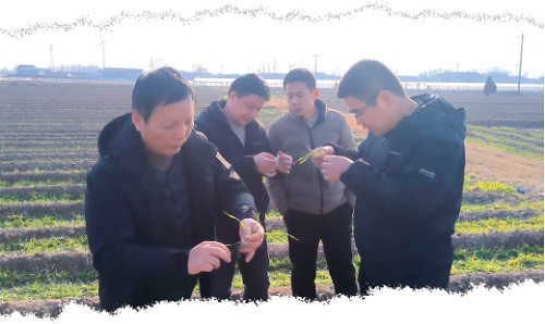 河南省内黄县农业技术推广站站长韩志乾(左一)在内黄县东庄镇三流河村调查小麦苗情。 受访者供图