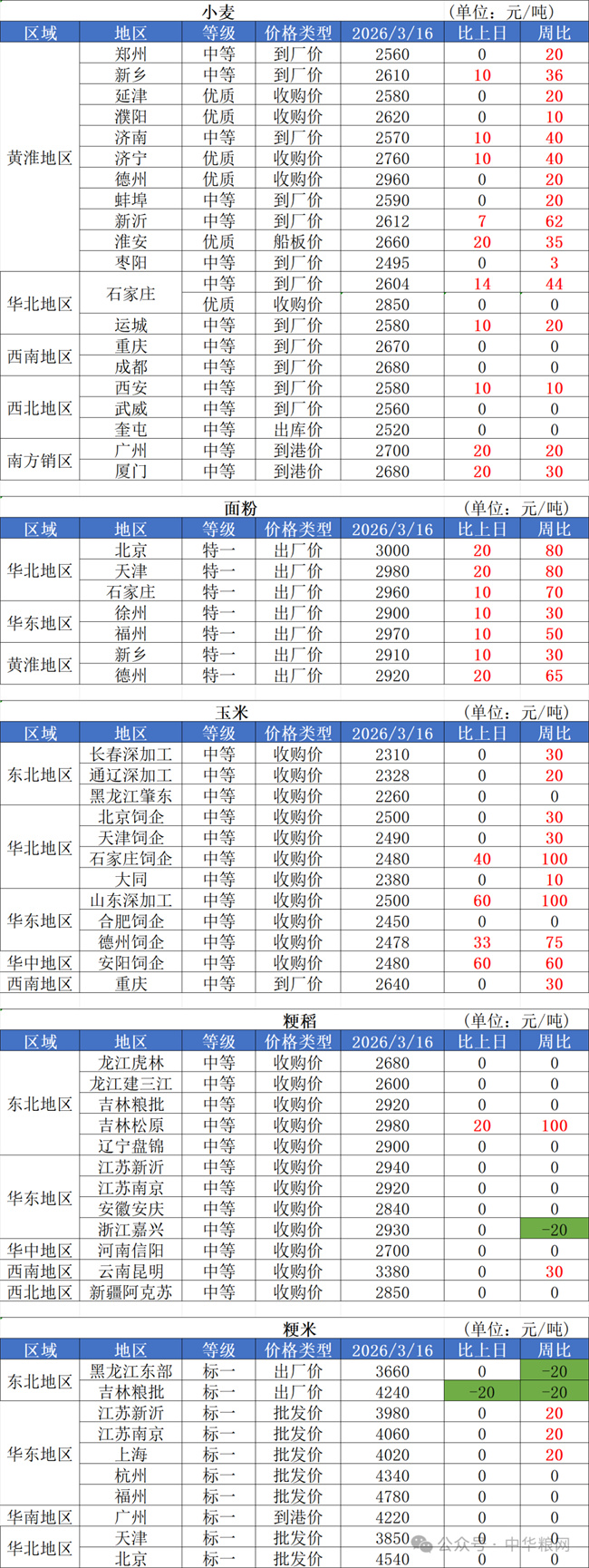 3、3月16日,广东华南粮食交易中心竞价销售2024年入库早籼稻珍桂4629.99吨,全部流拍,底价2900元/吨;竞价采购2026年2月及以后产泰国白米1200吨,成交1200吨,成交率100%,底价3700元/吨,成交均价3670元/吨。