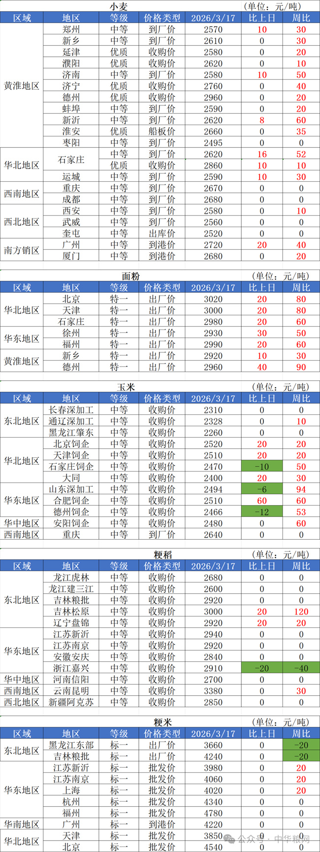 1、3月17日,小麦市场价格延续偏强趋势,涨幅在5厘-1分,目前多数企业突破1.3元/斤关口,其中山东天邦面业上涨至1.324元/斤,再次刷新阶段性高点。