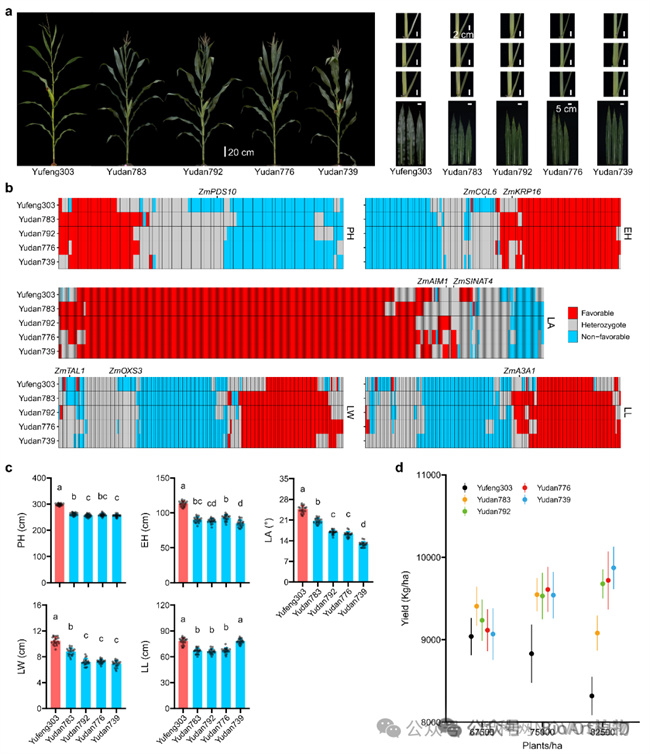 最终,团队成功选育出4个株型显著改良的玉米新杂交种(图4a)。基因组测序证实,所有改良品种均成功累积了更高比例的株型优异等位基因(图4b)。