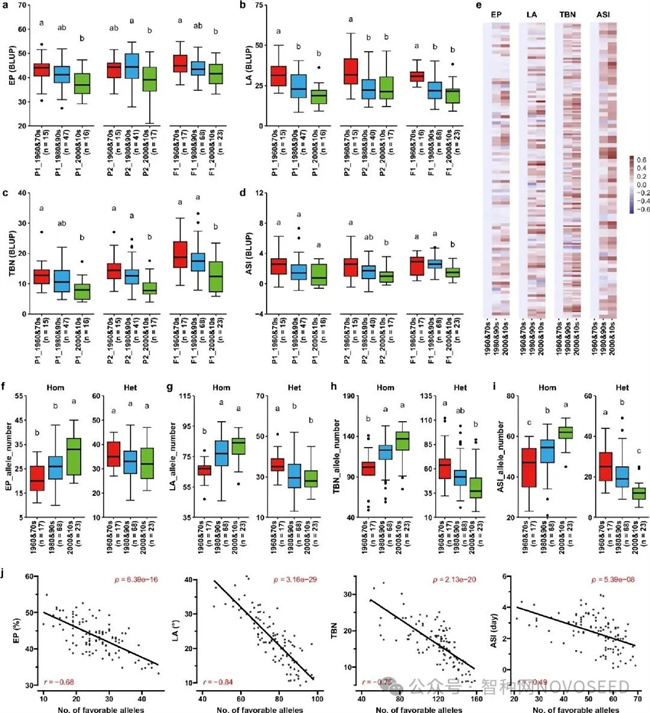 在现代育种过程中,育种家虽然依靠的是表型选择,但在基因组层面,实际上是在不断累积那些能够优化株型(如降低穗位、使叶片直立)的优异等位基因(图1e–j)。这一发现为从基因组层面直接设计理想株型提供了理论依据。