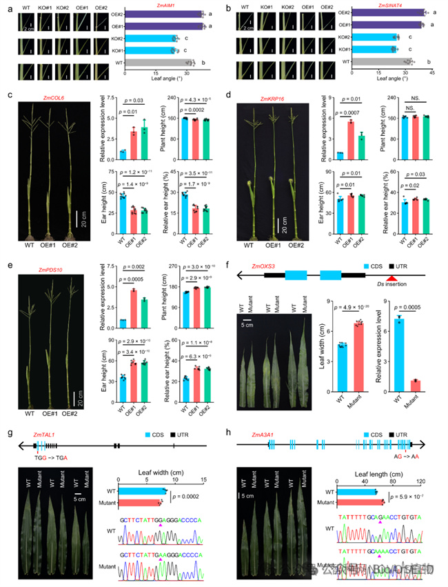 此外,团队还通过GWAS挖掘了一批株型重要调控基因,包括调控株高和穗位高的基因ZmCOL6、ZmKRP16和ZmPDS10,调控叶宽的基因ZmOXS3和ZmTAL1,以及调控叶长的基因ZmA3A1(图2)。