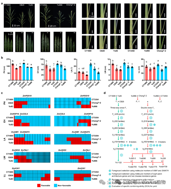 (2)精准筛选供体自交系:利用全基因组信息,从众多种质资源中精准筛选出CB28、Yu82、Chang7-2和Yu866四个优异自交系作为供体(图3a–b)。这些供体不仅株型紧凑、耐密性强,且在基因组层面富集了大量可弥补底盘亲本缺陷的株型优异等位基因(图3c)。