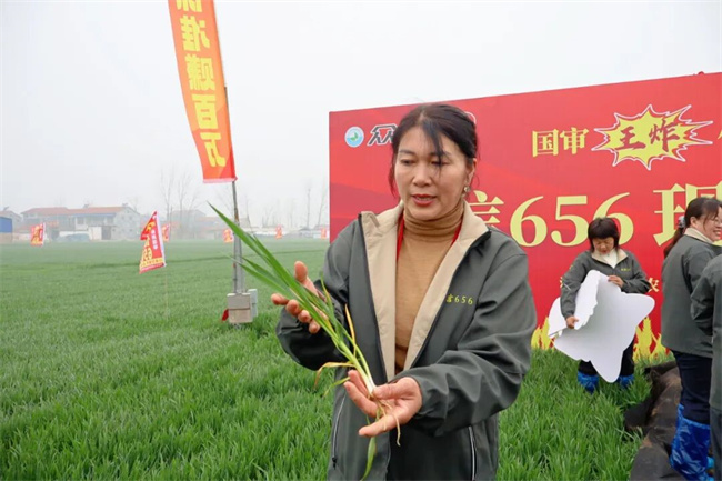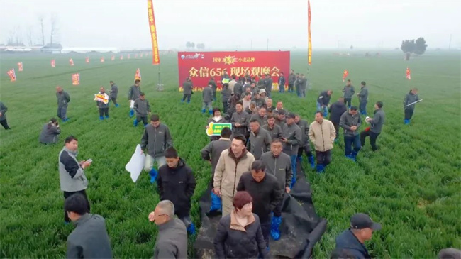 会议开始前,与会经销商走进示范田,实地观摩众信656苗情表现。麦苗整齐、叶色浓绿、群体均衡,整体长势稳健。