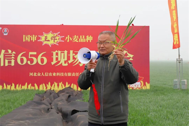 在专题分享中,众人信科研总监李书民系统介绍了公司科研体系与品种选育路径。依托稳定的科研团队、多点试验平台以及分子技术与传统育种的融合应用,公司持续推出适应性强、产量潜力突出的优质品种。围绕众信656的核心优势,现场总结出四个关键词:矮秆抗倒、穗大粒多、抗逆性强、高产稳产。在实际测产中,众信656最高亩产达到1066.28公斤,展现出扎实的增产能力。