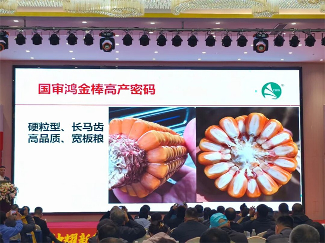 随后,公司总经理谢小二登台,围绕“新品种发布与企业文化”两大核心展开分享,成为本次峰会的核心亮点。谢总首先从国家粮食安全、农户实际需求出发,深入分析当前玉米种植面临的痛点:部分品种抗病性不足、抗倒能力弱,导致农户减产损失;区域适应性有限,限制了优质种源的推广普及。针对这些行业痛点,谢总详细介绍了鸿金棒玉米新品种的核心优势:耐密高产、抗逆性强、高品质硬质粮,既满足农户种植需求,也契合市场推广大势。