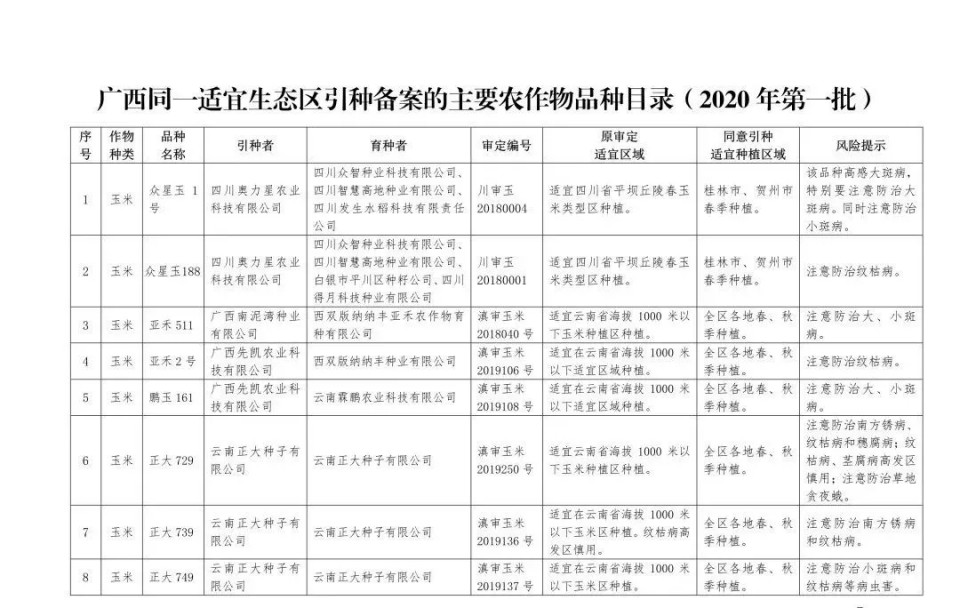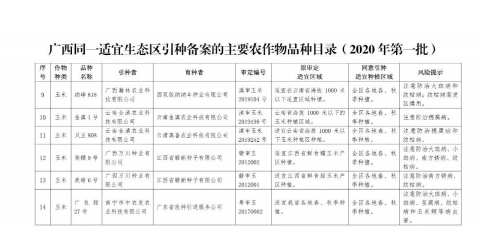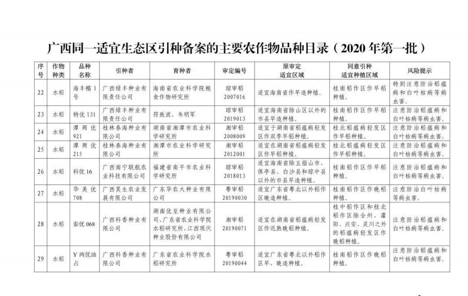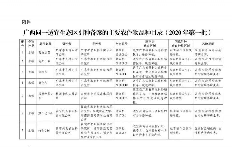 广西壮族自治区农业农村厅引种备案公告(2020年第一批)