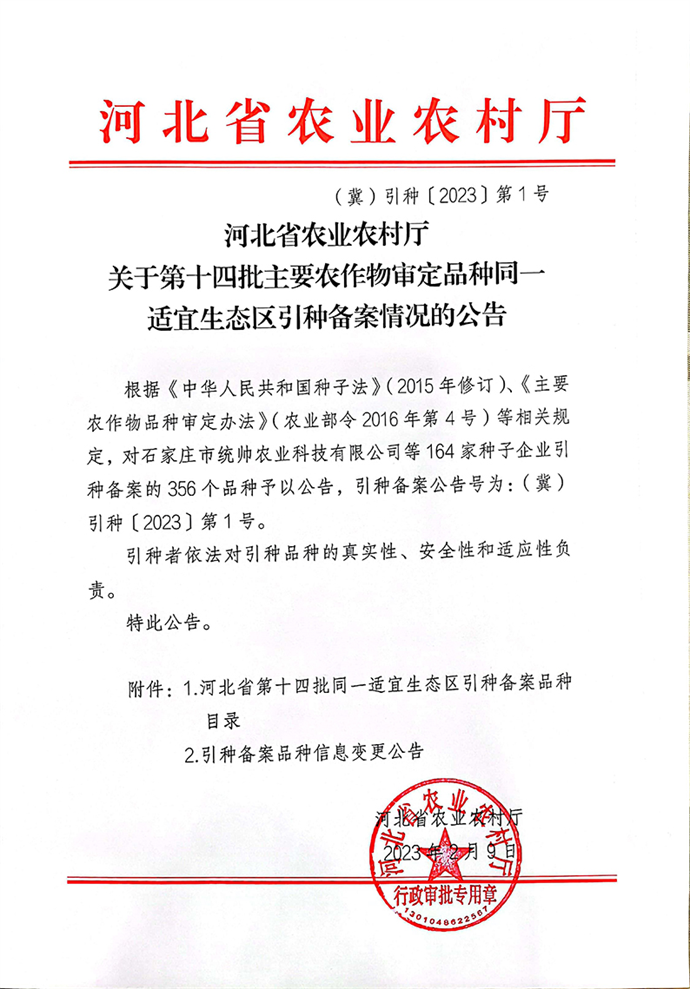河北省农业农村厅关于第十四批主要农作物审定品种同一适宜生态区引种备案情况的公告