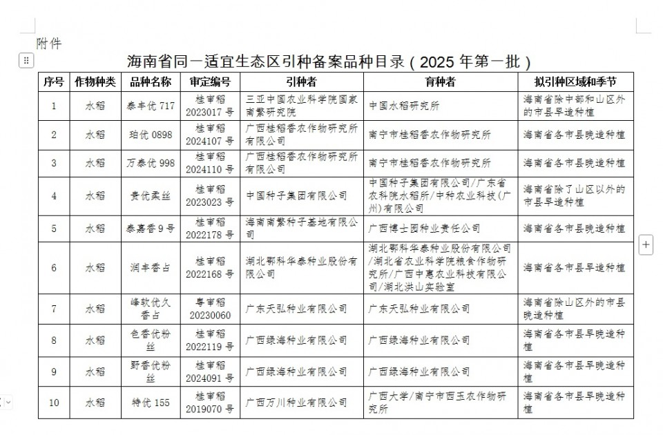 附件:海南省同一适宜生态区引种备案品种目录(2025年第一批)