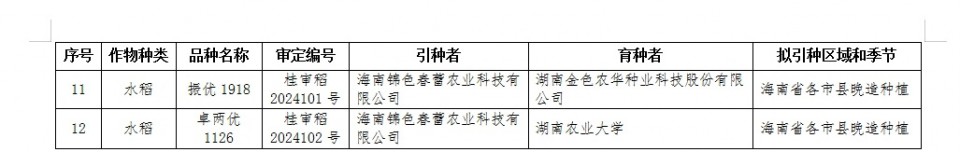 根据《中华人民共和国种子法》《主要农作物品种审定办法》《海南省农业厅关于开展同一适宜生态区主要农作物审定品种引种备案工作的通知》(琼农字〔2017〕79号)等相关规定,经初审,泰丰优717、珀优0898、万泰优998、贵优柔丝、泰嘉香9号、润丰香占、峰软优久香占、色香优粉丝、野香优粉丝、特优155、振优1918、卓两优1126等12个水稻品种符合主要农作物同一适宜生态区引种备案条件,现予公示,公示期为2025年6月11日至2025年6月17日。公示期内如有异议,可向海南省农作物品种审定委员会办公室书面反馈,同时提供办公电话、手机号码、电子邮件等联系方式,并由异议人本人签字或加盖异议单位公章。