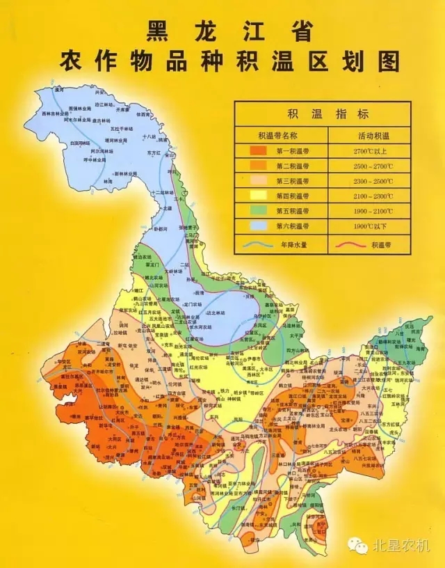积温高低直接影响作物生产和当地的植被类型。黑龙江是重要的商品粮生产基地,为了便于指导农业生产,黑龙江又将本省划分为6个积温带。具体如下: