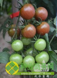 台湾引进的杂交一代黑色小番茄,无限生长型,果实圆球形,紫黑色,单果重20-25克左右,花序长,产量高,口感极佳,综合抗病性强,硬度好,耐贮运。