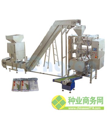 此机组包含了VFS7300全自动立式包装机,CJS 2000全自动电子称量机,DT5 Z型斗式提升机,DT5 倾斜式斗式提升机,ZB2000(一体式)真空包装机组以及成品输送机。该机组实现了自动送料,计量,充填,抽真空,封口,整形,打印,冲孔,计数,成品输送与一体。机器的长期正常稳定运行。该机组广泛应用于大米等谷物类产品的真空包装,袋型美观,密封效果好,密封时间长。
