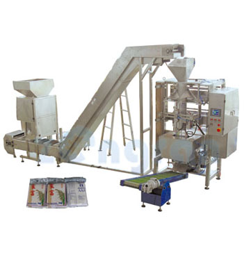 此机组包含了VFS7300全自动立式包装机,CJS 2000全自动电子称量机,DT5 Z型斗式提升机,DT5 倾斜式斗式提升机,ZB2000(一体式)真空包装机组以及成品输送机。该机组实现了自动送料,计量,充填,抽真空,封口,整形,打印,冲孔,计数,成品输送与一体。机器的长期正常稳定运行。该机组广泛应用于大米等谷物类产品的真空包装,袋型美观,密封效果好,密封时间长。