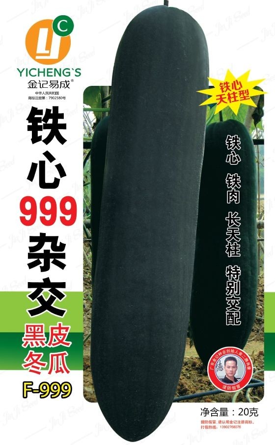 该品种为金记公司特别杂交交配良种,植株生长旺盛,叶色深绿,果实炮弹形,瓜形较瘦长柱型,皮极墨黑色,一般单瓜重20-25kg左右,横径约23-25cm左右,瓜长约70-90cm,无棱沟,肉厚,肉质致密,空腔小,耐贮运。田间表现抗枯萎病、疫病强