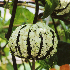 瓜皮。扁球形小果,瓜皮色为绿白条纹相间,像西瓜皮,果径4-6厘米,果高4厘米左右,单果重80克,果肉淡黄色,肉厚1-2厘米,每株挂果5-10个,以主蔓结瓜为主。观赏性强,耐贮存。