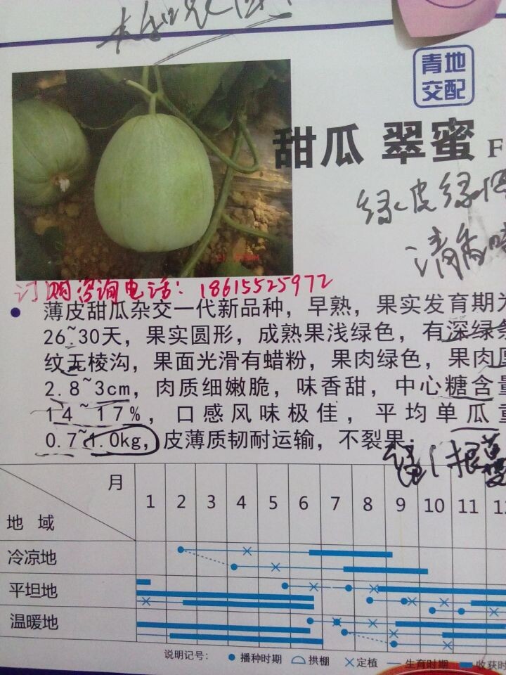 甜瓜 翠蜜也是我们的优势产品。翠蜜绿皮绿肉,果面光滑,清香味浓,肉质嫩,果肉厚(2.8-3cm)含糖量14-17%,一代杂交,产量大,抗病强,果实零售价高。我们是最早引进绿皮绿肉的甜瓜,其他的为多次杂交,品质不能和一代杂交的相媲美,不种不知道,种了还想种。960多粒/袋,量大价优,欢迎来电咨询18615525972张。