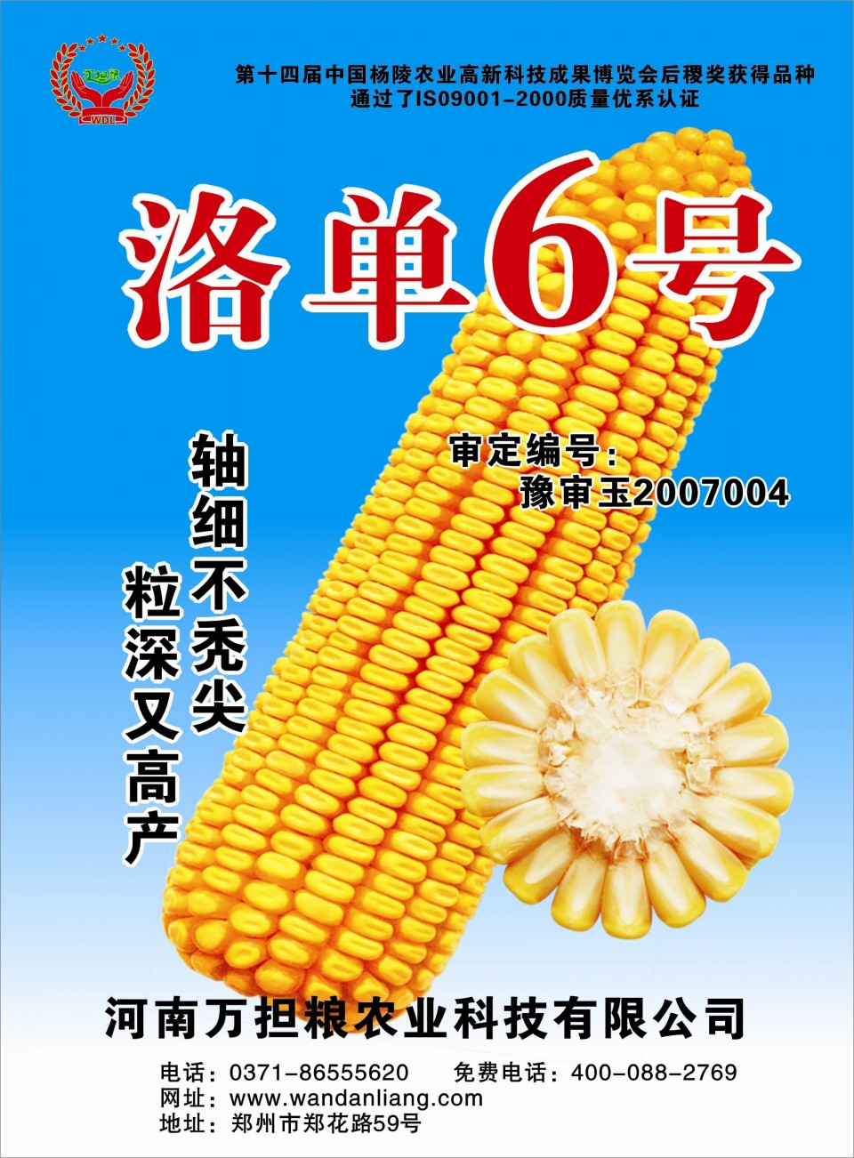 洛单6号:产品介绍:该品种夏播生育期94天左右。株高255CM,穗位高95CM,穗长19-23CM,穗粗5.2CM,马齿型,出籽率高,出籽率92%,抗病性好,高抗黑粉病,矮花叶病,大斑病,茎腐病。抗倒伏性强,活杆成熟。2006年参加河南省夏播玉米生产实验,比对照“郑单958”增产11.8%。2007年玉米专家实地测产每亩达815.7Kg。一般亩产达700多公斤,具有1000公斤的增产潜力,适宜密度为4000-4400株/亩。