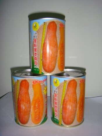 一代杂交金航蜜本南瓜A-001 净含量:50克/罐 待征特性: 品质优,产量高,植株葡萄型生长,分枝多,叶片钝角掌状形,绿色,叶脉交界处有不规则斑纹,第一雌花着生在15-18节,瓜为棒形,瓜顶端膨大,未成熟时瓜浅绿色,种子少且集中在瓜顶端上。成熟时瓜皮橙黄色,肉厚。瓜肉为橙红色,淀粉细腻,味甜,水份少,品质优良,单瓜重约3公斤,产量高。早中熟种,定植后85-90天可初收,抗逆性强,耐贮运。是金记公司多年来精心选育之优良品种。 栽培技术: 南方春秋两季栽培,春3-4月,秋7-8月播种,一般以“人”字形或“平铺”形架为宜,前期要防治猝倒病中后期防治霜霉病,多喷雾可湿性退菌药,爬蔓后要勤压蔓,勤打权,也可免搭架生长,可人工辅助授粉,促使多坐瓜,一般管理以当地种植习惯。