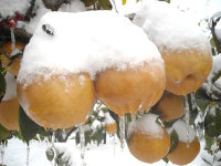 果实经济性状:晚秋黄梨果形扁圆,个大,平均单果重415克,最大单果重1400克,汁味甜,有哈密瓜的香味,可溶性固形物含量15%,果皮薄,黄褐色,套袋后淡黄褐色,果点大但不明显,果肉白而致密,石细胞少,清脆可口。