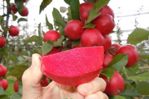 供应瑞士红色之爱红肉苹果树苗: 瑞士专家马库斯科波特花了近20年精心培育出一个红肉苹果新品种,该品种果肉玫瑰红,通体一色。有一个好听的名字”红色之爱”。临沂市河东区苗木专业种植合作社引种了多个品种的红肉苹果经过精心繁育和筛选,其中两个鲜食品种表现非常出色:该品种落花后到果实成熟,果面都是鲜红色,果面全红,油亮美观。成熟期为9月中下旬,自花结果,定植2年结果;短枝性状明显,适宜密植,丰产性高,抗逆性强、适应范围较一般苹果广、品质极佳、表皮和果肉都是鲜艳的红色,一年苗移栽后第二年结果、花量大不落果、枝条角度大、过度合理,用沂蒙山甜茶作砧木,亲和力好、寿命长、悬根露爪,自然成型能力极强!其初叶鲜红靓丽、盆栽丝毫不影响开花结果,集观赏、品尝、收藏实为一体,实为花果盆景之上上之选!天然居品牌,谨防假冒!