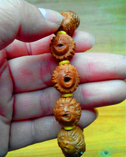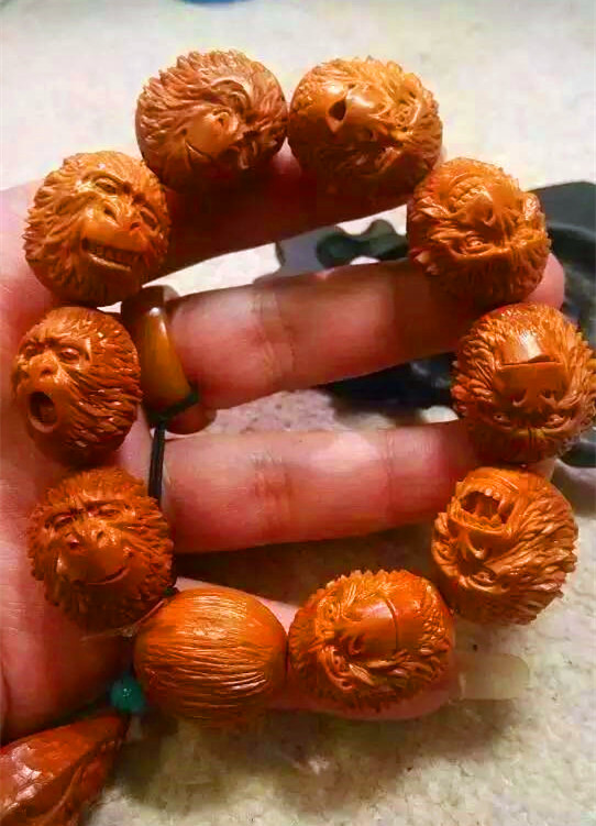 猴头核桃工艺品的加工制作方法主要有三种。第一,对果个小巧、果形正圆或矮桩、果壳纹路通达的猴头核桃,可直接打孔,制成素珠手串或长串。第二,对果形正圆或接近正圆的猴头核桃,可按粒径大小分选,经精心打磨、抛光后,制成光珠手串或长串。第三,通过雕刻,进一步提高猴头核桃的欣赏、实用和收藏价值。第三种方式最能彰显猴头核桃的特点,也给核雕师提供了充分发挥想象力,尽情展露才华和技能的广阔空间。雕刻造型的素材可以是常见的猴头,也可以是尊者、动物、水果、吉祥文字等。雕刻的物件可穿珠成串,也可单独把玩,例如用作钥匙坠、手包坠、手机挂坠、车内吊坠、居室摆件等等。