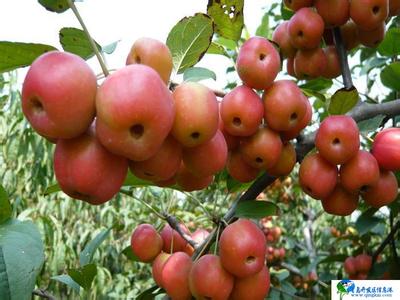 友谊苗木繁育基地:冬红海棠, 蔷薇科,苹果属,落叶小乔木.生物特性:树高可达5--7米;树冠开张,枝条粗壮,叶片肥厚浓绿,椭圆形,先端有圆钝,锯齿。掌状纹裂,幼时两面有短绒毛,老枝紫褐色,伞房花序:花5--12朵簇生,花萼紫红色,盛花粉色,花期载月中旬,自花授粉,座果率高,单果重6--10g,直径2-3厘米,成熟期11月初果实自7月始:由绿色转为透亮的金黄色后随季节的加深而逐渐的向红色过度。至成熟后颜色完全呈现出深红色,果表面洁净光亮,非常美丽.冬季不落果,一直点缀到翌年4月份,是海棠家族果实观赏期最长的品种! 因此而非常完美的解决了,园林绿化景观中冬季单调的现状。在漂雪的季节里而能够果实累累,实为一道亮丽的风景线。