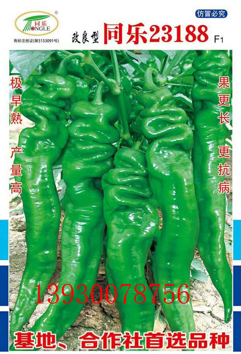 同乐23188:一代杂交螺丝椒,极早熟,始花节位10节左右,果长26-28cm,宽3-4cm,单果重60-120g左右,果皮绿色,辣味浓,肉厚质佳,耐运输,耐低温,抗高温,抗病。节间短,挂果多,膨果快,连续结果能力强,产量高,栽培适当亩产6700kg以上。