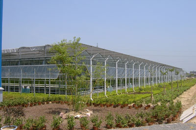纹络式温室大棚 ,主体采用热镀锌钢制骨架,人字型屋脊。覆盖材料:顶部采用国产4mm或5mm厚浮法玻璃覆盖,该材料具有透光率高、密封性好、采光好、强度高、阻燃、耐用等优点。特点介绍:外形美观,透光率高而稳定,通风面积大,密封性能好,排水能力强;不足之处是保温能力相对PC板温室和双层薄膜温室差,能耗相对较高,为增强保温性能,可使用双层玻璃。适合于花卉种植、种苗繁育、花卉市场、生态酒店、科研等多种用途。