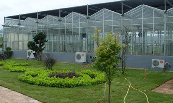 玻璃的高透光性非常适合于高光作物的种植。双坡面温室操作空间大,便于机械化作业;而且其采光面积大,室内光照均匀;占地面积大,地面利用率高。门式钢架结构的玻璃温室,主体结构采用热浸镀锌表面防腐,单位面积用钢量小。但双坡面玻璃到保温比小,散热面积多,在冬季特别是在严寒地区因其采暖负荷大,所以,运行成本高.。Venlo型温室是一种源于荷兰的小层面双坡面玻璃温室。它的结构特点是构件截面小,安装简单,使用寿命长,便于维护等。结构材料,钢柱及侧墙檩条采用热浸镀锌轻钢结构,屋面托架采用桁架结构,屋面梁采用专用铝合金型材。屋面采光材料选用4毫米厚浮法玻璃,玻璃透光率高,密封性好,通风面积大使用灵活特点