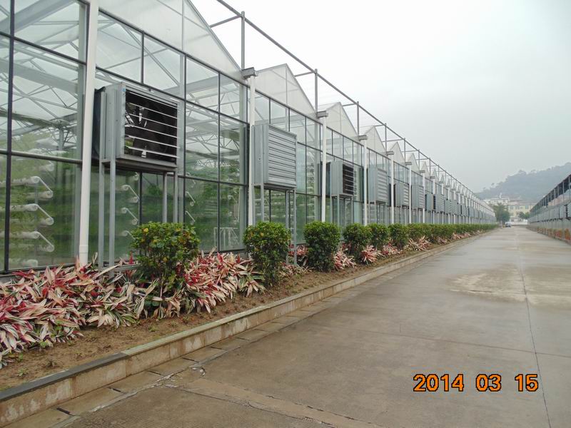 玻璃的高透光性非常适合于高光作物的种植。双坡面温室操作空间大,便于机械化作业;而且其采光面积大,室内光照均匀;占地面积大,地面利用率高。门式钢架结构的玻璃温室,主体结构采用热浸镀锌表面防腐,单位面积用钢量小。但双坡面玻璃到保温比小,散热面积多,在冬季特别是在严寒地区因其采暖负荷大,所以,运行成本高.。Venlo型温室是一种源于荷兰的小层面双坡面玻璃温室。它的结构特点是构件截面小,安装简单,使用寿命长,便于维护等。结构材料,钢柱及侧墙檩条采用热浸镀锌轻钢结构,屋面托架采用桁架结构,屋面梁采用专用铝合金型材。屋面采光材料选用4毫米厚浮法玻璃,玻璃透光率高,密封性好,通风面积大使用灵活特点