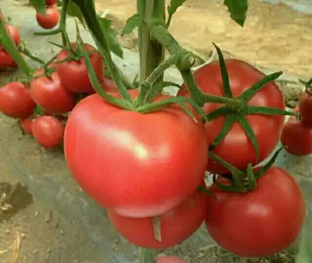 国外引进高档粉果大番茄,无限生长,植株长势壮,中早熟,果实圆形,成熟时果深粉红色,果形美观,商品率高,单果重250-300g左右,果脐小,果皮厚,硬度高,耐储运,抗TY病毒、根结线虫叶霉病、枯萎病等病害,连续座果能力强,产量高,适合早春,秋延温室大棚栽培。