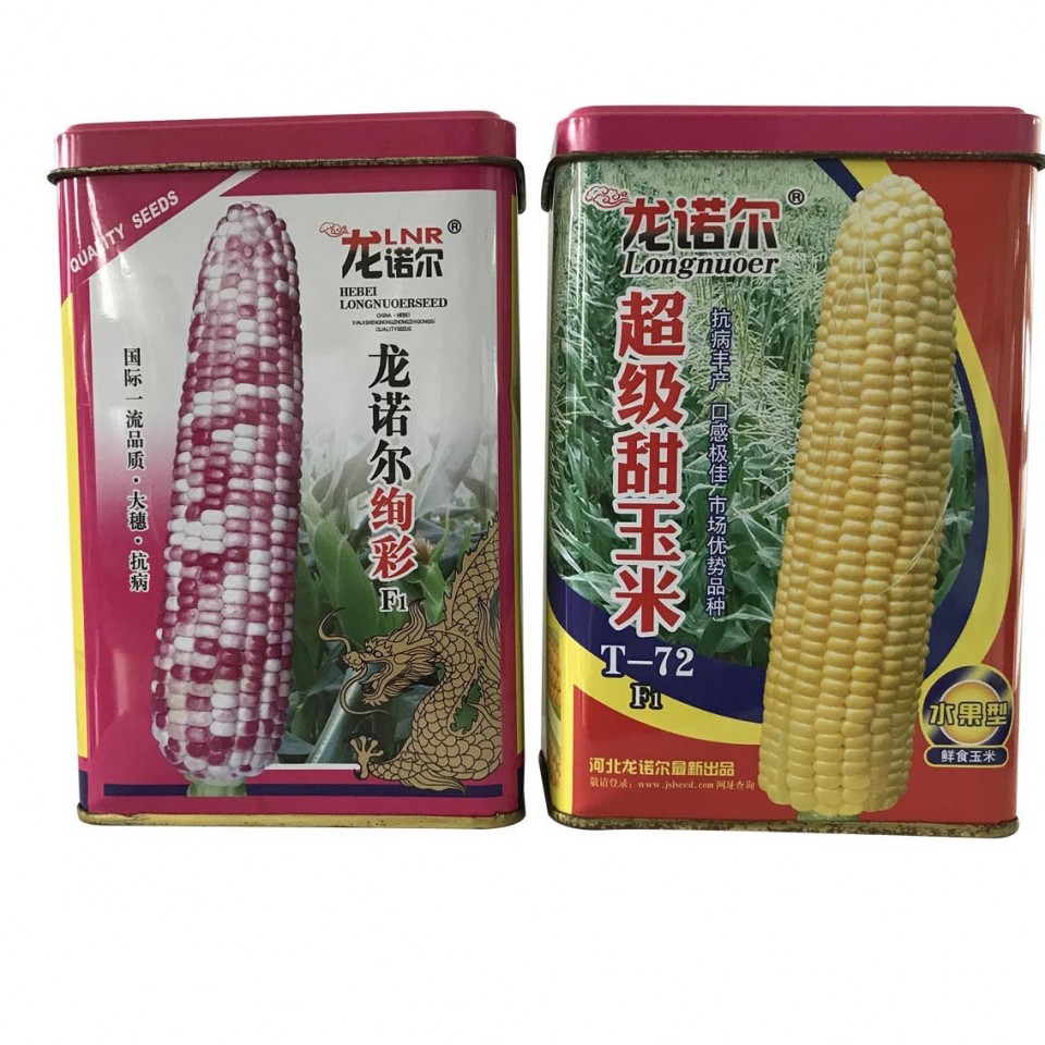 今天的这款龙诺尔超级甜玉米铁罐,是根据客户要求进行设计的。铁盒外包装采用的工艺印刷为四色印刷,图案的设计是应时代潮流,符合消费者购买习性而精心设计,让您的产品具有金属感,提升玉米种子的档次,让您的产品在激烈的竞争中脱颖而出,何乐而不为呢?